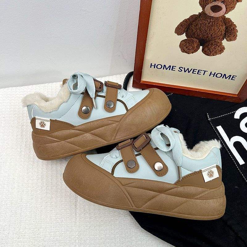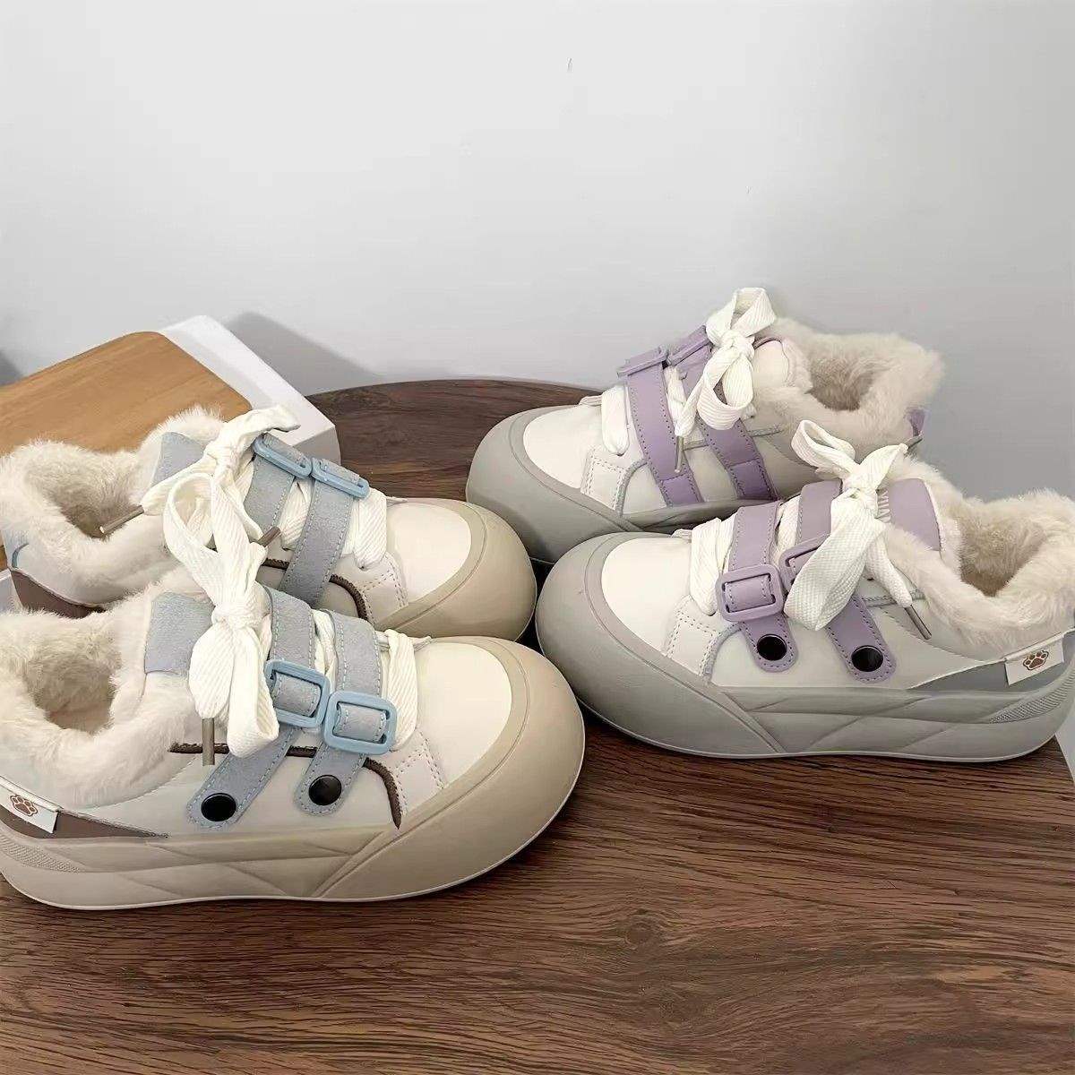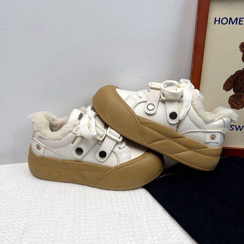 2026 Autumn Winter New Thick-Soled Wool-Lined Sneakers | Women Height-Increasing Ugly-Cute White Shoes with Rubber Sole and Fabric Lining, Women Shoes